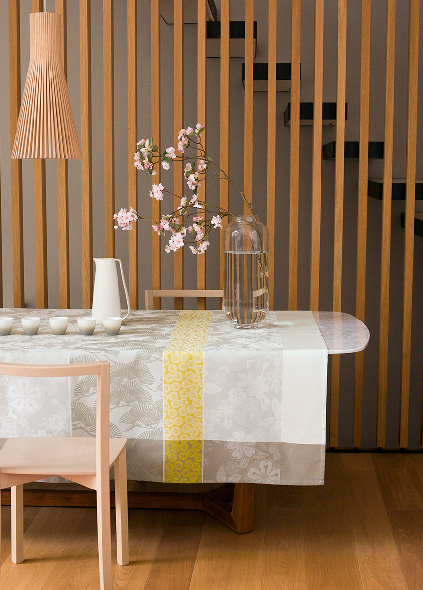 Sakura Inspired by the motifs on Japanese kimonos and paper, this design renews floral motifs in a free-flowing and graphic style outside of a framework. Stripes puncutate the whirlwind of whtie cherryblossoms. You find yourself daydreaming..