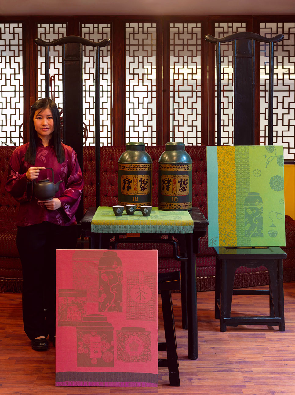 From China and Japan to England…this collection of bowls and teapots, outlined on Chinese backgrounds, is inspired by Japanese textiles and Victorian tapestries.